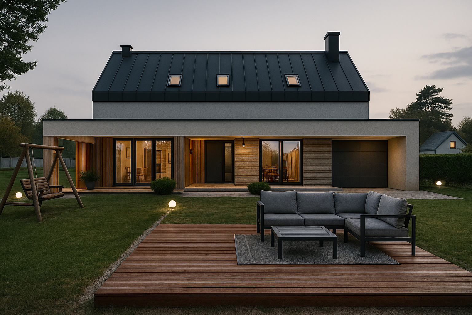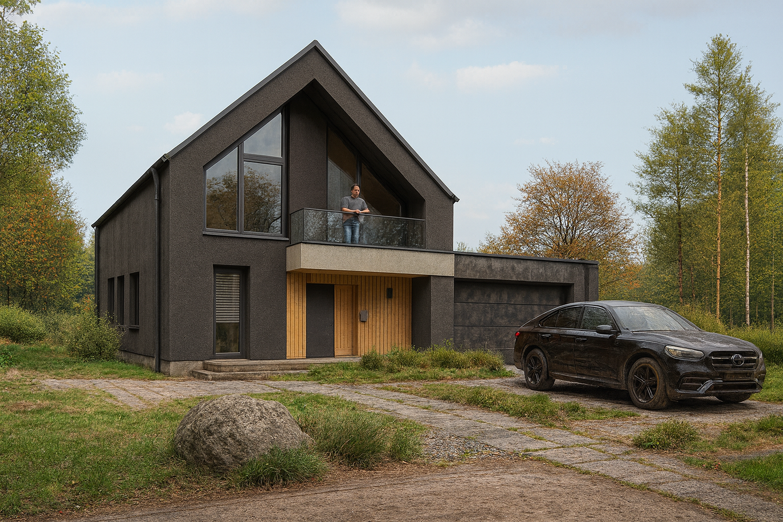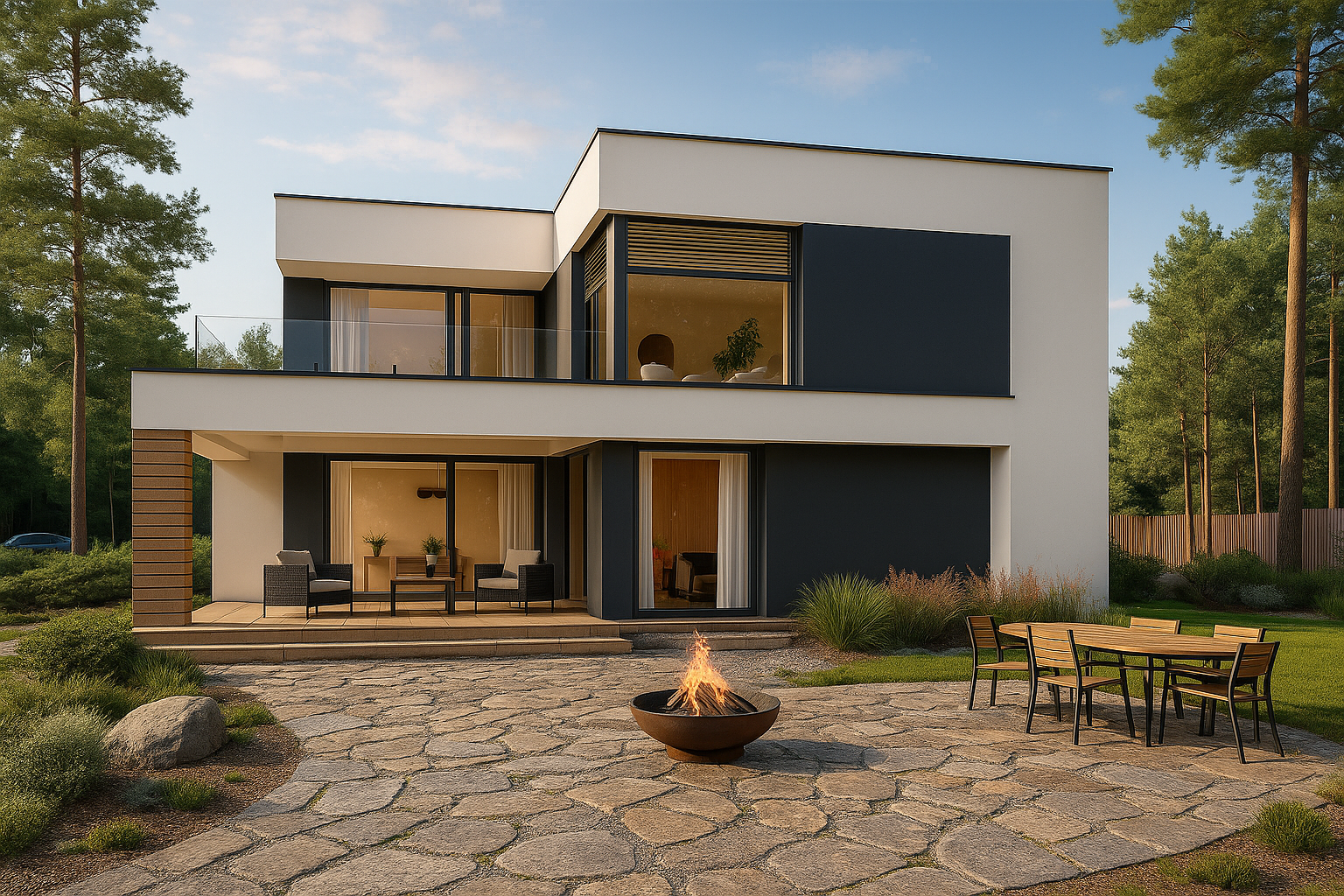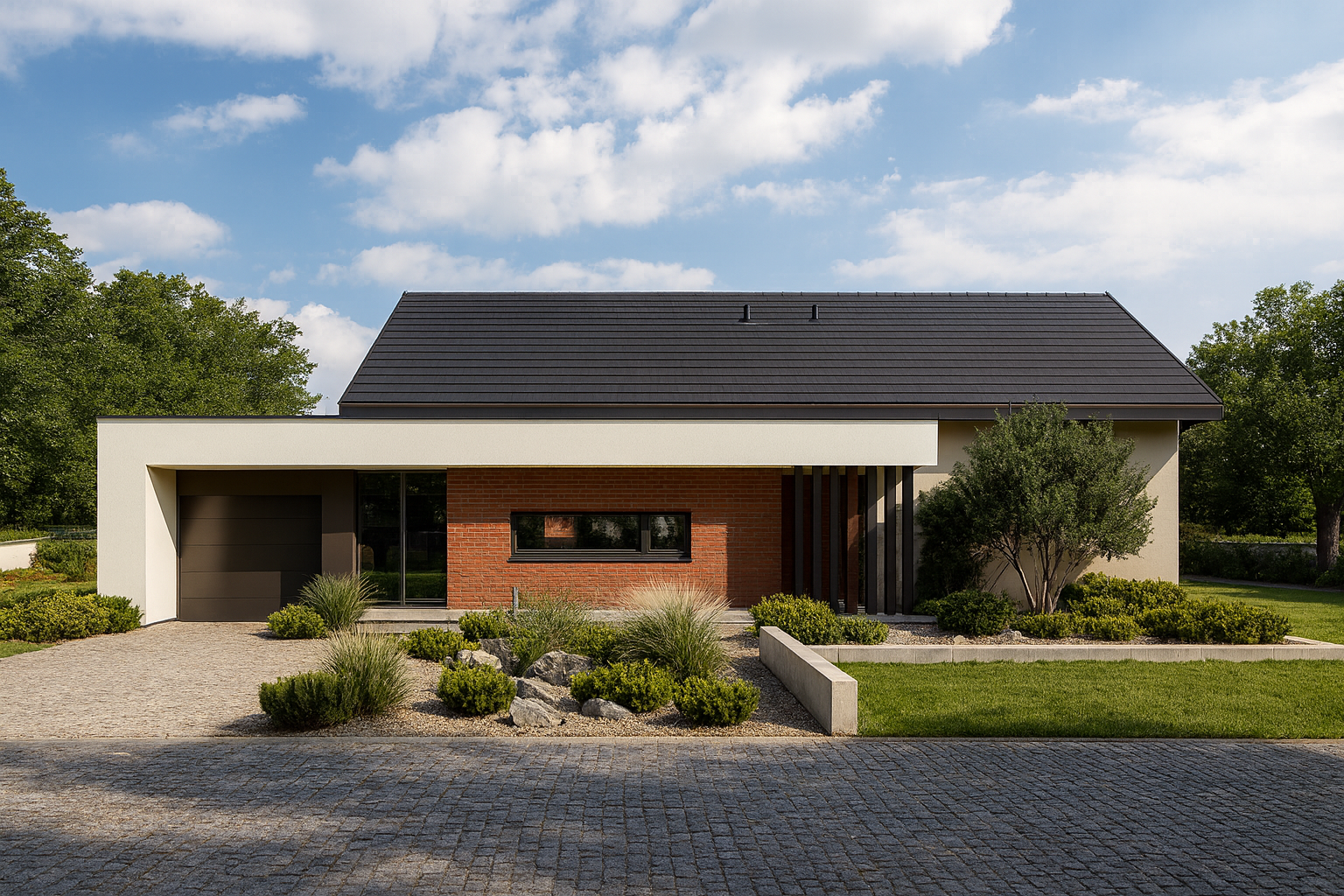 Fassade: Silikonputz kombiniert mit Klinkerfliesen.