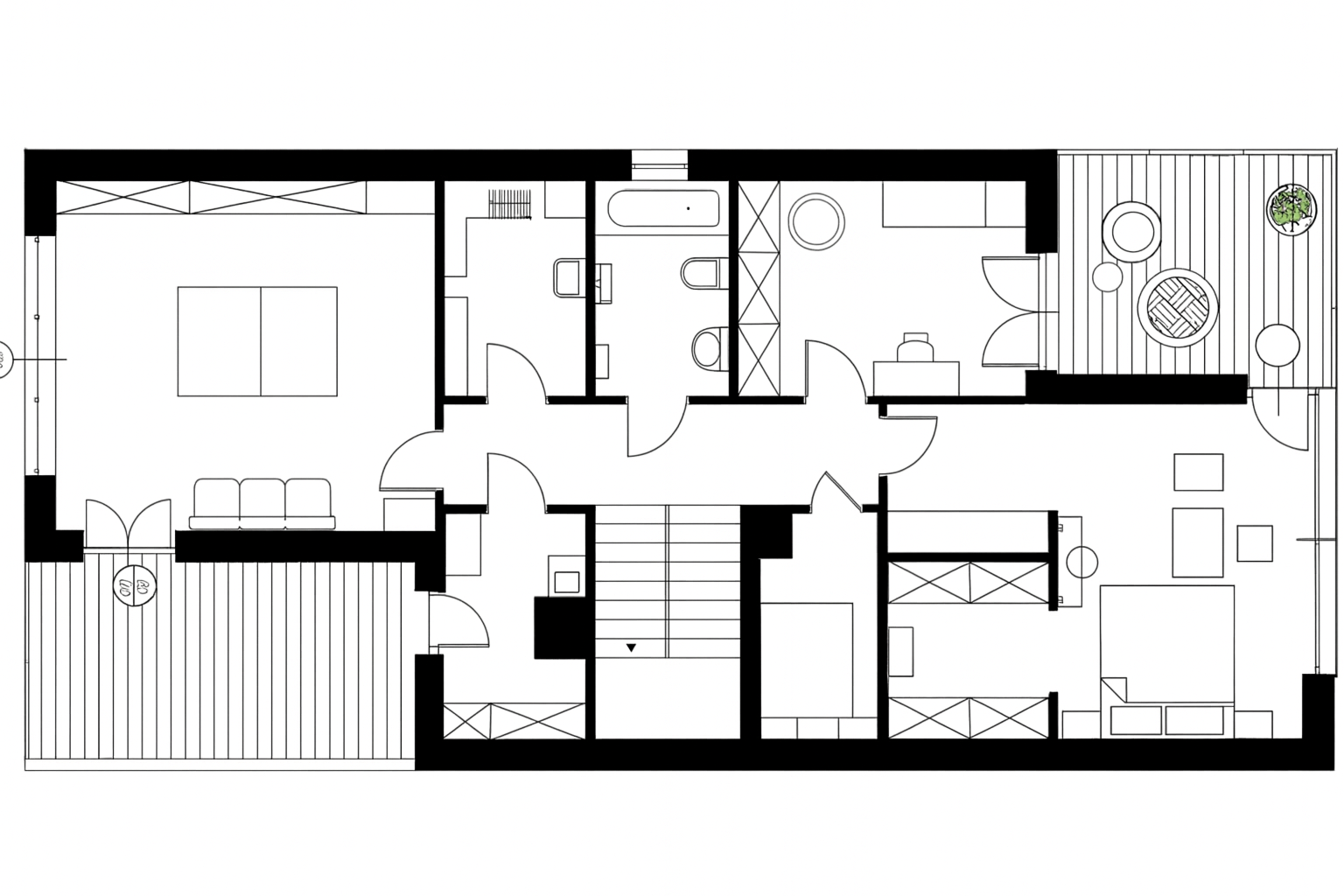 Dach: flache, wärmeverschweisste Dachpappe, VELUX Dachfenster