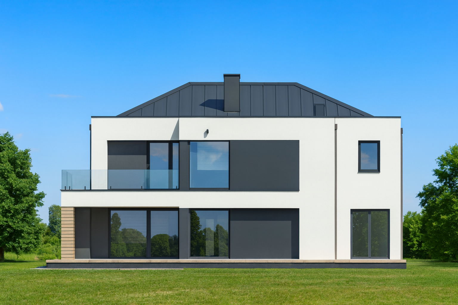 Dach: Walm, Neigung 25 Grad, Holzbinder, Blech