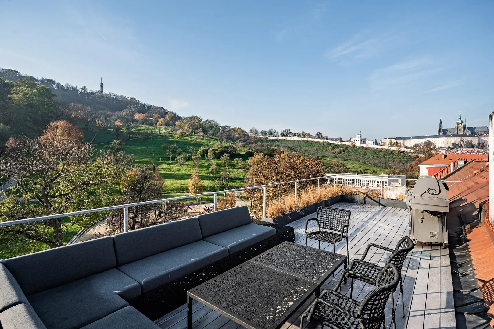 Die Wohnung verfügt über einen sensibel getrennten sozialen und privaten Teil, beide sind nach Westen ausgerichtet. Die Sozialzone besteht aus einem offenen Raum für ein Wohnzimmer, ein Esszimmer, eine Küche und einen Sitzbereich für die Gäste, von wo aus man Zugang zur Terrasse mit Blick auf den Hradčany hat. Der private Teil der Wohnung umfasst ein Schlafzimmer mit begehbarem Kleiderschrank, ein 2. Schlafzimmer mit eigenem Bad, ein 2. Badezimmer mit Badewanne und Dusche, ein 3. Badezimmer mit Sauna, ein Gästezimmer, einen Flur und ein Foyer.
