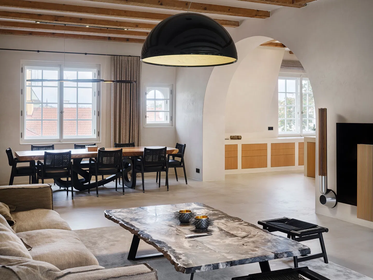 Der Hauptwohnbereich wird durch gewölbte Türkonstruktionen und Sichtbalken zu etwas Besonderem, die Deckenhöhe erreicht bis zu 3,1 Meter. Das minimalistische Interieur vermittelt somit einen luftigen, dank der erdigen Farbpalette auch einen sehr gemütlichen Eindruck. Die Wohnung verfügt über Holzflügelfenster, die eine originalgetreue Nachbildung sind (Dreifachverglasung auf der Innenseite), Innentüren mit verdeckten Scharnieren und Böden aus Betonepox-Betonestrich. Die Küche mit einer maßgefertigten Kochinsel ist mit Miele-Geräten (u.a. eingebauter Weinkühlschrank) und einem Liebherr-Gefrierschrank ausgestattet. Die Bad-Sanitärkeramik stammt vom italienischen Hersteller GESSI. Die Deckenklimaanlage TOSHIBA sorgt für Kühlung, die Fußbodenheizung sorgt für thermischen Komfort im Winter. Eine Gastherme und ein Boiler zum Erhitzen von Wasser befinden sich in einem Schrank hinter dem Gästezimmer. Die Wohnung verfügt über einen Anteil am Gemeinschaftsgrundstück (abschließbarer Hof), auf dem bis zu zwei Autos geparkt werden können.