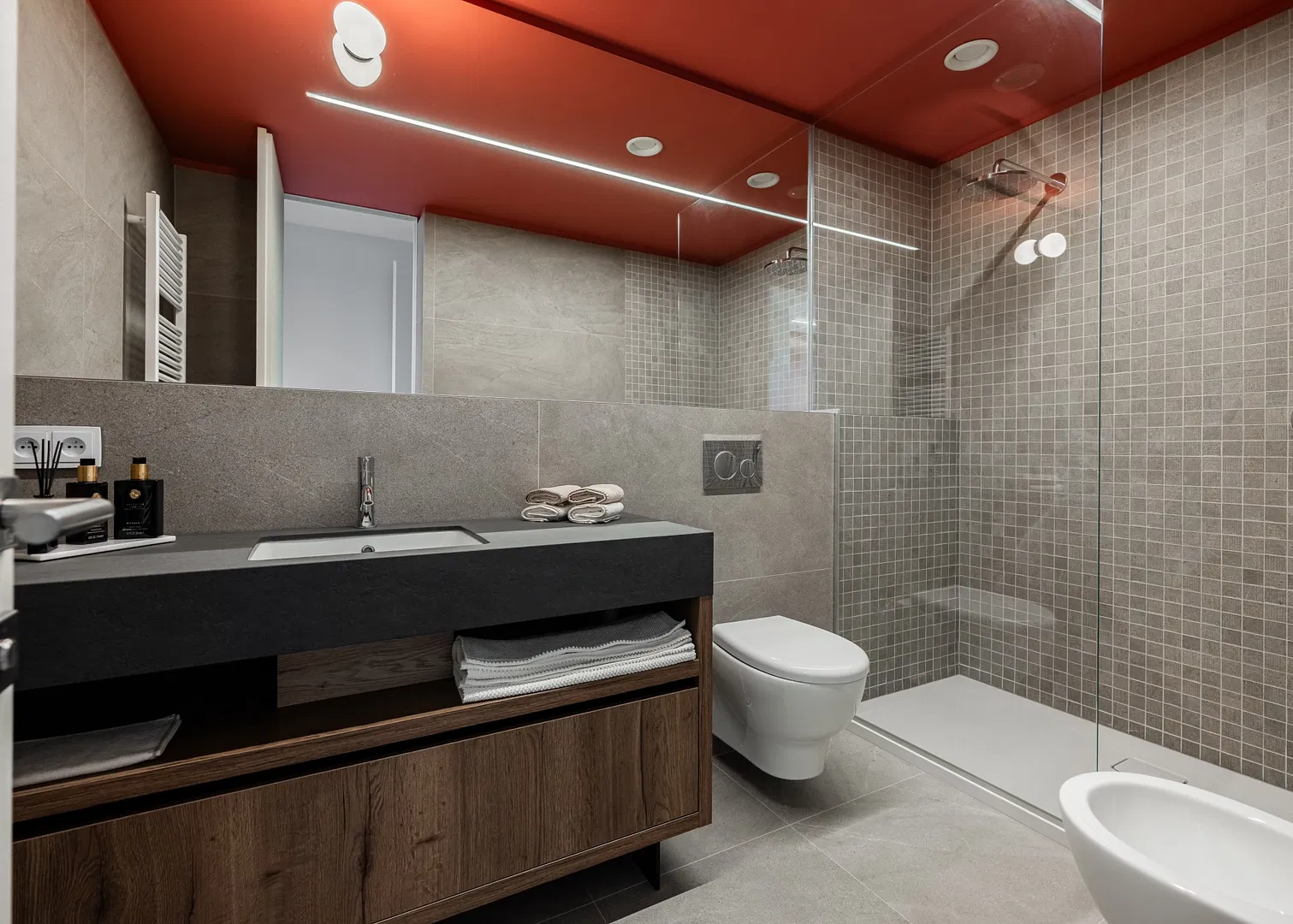 Die Aufteilung der Wohnung im 7. Stock besteht aus einem Wohnzimmer mit offener Küche, einem Essbereich, Zugang zu einem großen Balkon und einer Treppe zur Dachterrasse, einem Hauptschlafzimmer mit begehbarem Kleiderschrank, einem eigenen Bad und einem privaten Balkon, weiteren 2 Schlafzimmern mit eigenem Bad, einer separaten Toilette und einem Hauswirtschaftsraum mit Anschluss für eine Waschmaschine und einen Trockner. Die 120 m lange private Dachterrasse verfügt über einen Whirlpool zum Entspannen mit erstklassigem Blick auf die Prager Skyline.